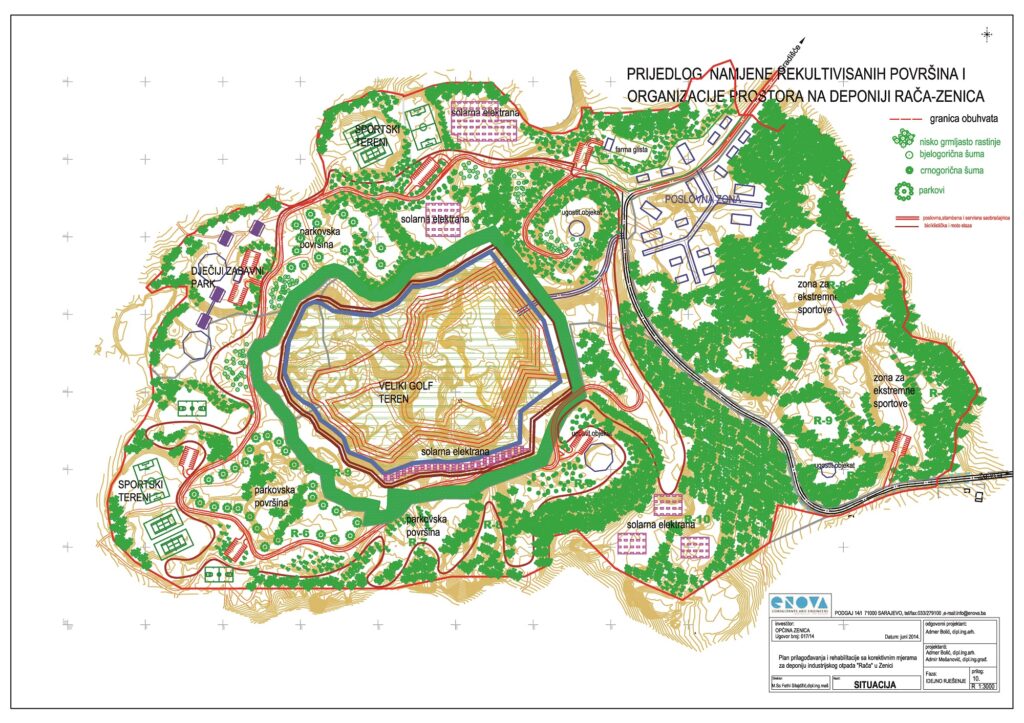 Javnim pozivom predviđeno je da se stabilizacija, sanacija i rehabilitacija deponije Rača trebaju provesti prema Planu prilagođavanja iz 2014. godine. Tim dokumentom planirano je da se na lokacije sadašnje deponije izgrade golf teren, sportski tereni, solarna elektrana, poslovna zona, dječiji zabavni park i zona za ekstremne sportove.